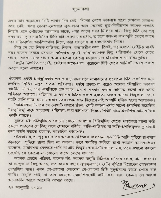 কিন্তু সে তো নিছক ব্যক্তিগত, নিজস্ব, অভন্ত্যরীণ কথা। ঠিকই, তবু হয়তো সেইটুকু মাত্রই নয়। অনেক সময়ে সেখানে ব্যক্তিগত সূত্রেই ব্যক্তিনিরপেক্ষ কিছু পরিপার্শ্বও থেকে যেতে পারে, থেকে যেতে পারে অন্য কোনো কোনো মানুষজনের চরিত্রাভাস বা চরিত্রদ্যুতি। কিছুটা দ্বিধান্বিত ভাবেই, সেইসব জমে-থাকা পুরোনো চিঠি থেকে খানিকটা অংশ প্রকাশ করতে হলো এখানে।”