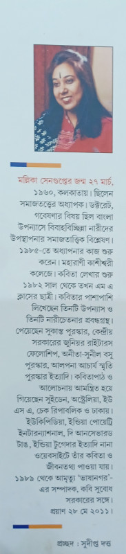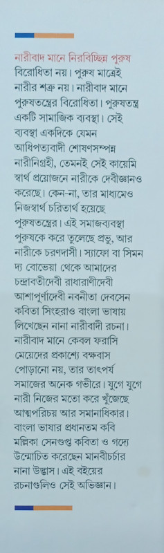নারীবাদ মানে নিরবিচ্ছিন্ন পুরুষ বিরোধিতা নয়। পুরুষ মাত্রেই নারীর শত্রু নয়। নারীবাদ মানে পুরুষতন্ত্রের বিরোধিতা। পুরুষতন্ত্র একটি সামাজিক ব্যবস্থা। সেই ব্যবস্থা একদিকে যেমন আধিপত্যবাদী শোষণসম্পন্ন নারীনিগ্রহী, তেমনই সেই কায়েমি স্বার্থ প্রয়োজনে নারীকে দেবীজ্ঞানও করেছে। কেননা, তার মাধ্যমেও নিজস্বার্থ চরিতার্থ হয়েছে পুরুষতন্ত্রের। এই সমাজব্যবস্থা পুরুষকে করে তুলেছে প্রভু, আর নারীকে চরণদাসী। স্যাফো বা সিমন দ্য বোভেয়া থেকে আমাদের চন্দ্রাবতীদেবী রাধারাণীদেবী আশাপূর্ণাদেবী নবনীতা দেবসেন কবিতা সিংহরাও বাংলা ভাষায় লিখেছেন নানা নারীবাদী রচনা। নারীবাদ মানে কেবল ফরাসি মেয়েদের প্রকাশ্যে বক্ষবাস পোড়ানো নয়, তার তাৎপর্য সমাজের অনেক গভীরে। যুগে যুগে নারী নিজের মতো করে খুঁজেছে আত্মপরিচয় আর সমানাধিকার। বাংলা ভাষার প্রধানতম কবি মল্লিকা সেনগুপ্ত কবিতা ও গদ্যে উন্মোচিত করেছেন মানবীচর্চার নানা উদ্ভাস। এই বইয়ের রচনাগুলিও সেই অভিজ্ঞান।