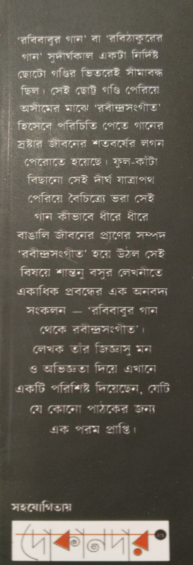 'রবিবাবুর গান' বা 'রবিঠাকুরের গান' সুদীর্ঘকাল একটা নির্দিষ্ট ছোটো গণ্ডির ভিতরেই সীমাবদ্ধ ছিল। সেই ছোট্ট গণ্ডি পেরিয়ে অসীমের মাঝে ‘রবীন্দ্রসংগীত' হিসেবে পরিচিতি পেতে গানের স্রষ্টার জীবনের শতবর্ষের লগন পেরোতে হয়েছে। ফুল-কাঁটা বিছানো সেই দীর্ঘ যাত্রাপথ পেরিয়ে বৈচিত্র্যে ভরা সেই গান কীভাবে ধীরে ধীরে বাঙালি জীবনের প্রাণের সম্পদ 'রবীন্দ্রসংগীত' হয়ে উঠল সেই বিষয়ে শান্তনু বসুর লেখনীতে একাধিক প্রবন্ধের এক অনবদ্য সংকলন – ‘রবিবাবুর গান থেকে রবীন্দ্রসংগীত'। লেখক তাঁর জিজ্ঞাসু মন ও