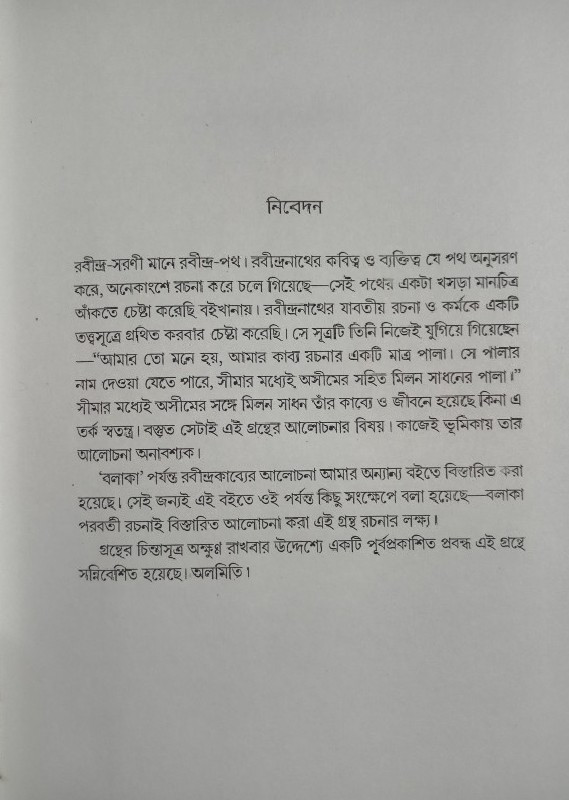 'বলাকা' পর্যন্ত রবীন্দ্রকাব্যের আলোচনা আমার অন্যান্য বইতে বিস্তারিত করা হয়েছে। সেই জন্যই এই বইতে ওই পর্যন্ত কিছু সংক্ষেপে বলা হয়েছে বলাকা পরবর্তী রচনাই বিস্তারিত আলোচনা করা এই গ্রন্থ রচনার লক্ষ্য।