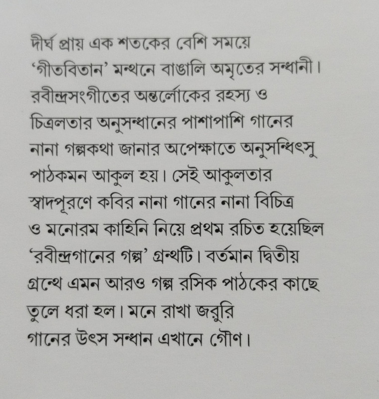 দীর্ঘ প্রায় এক শতকের বেশি সময়ে 'গীতবিতান' মানে বাঙালি অমৃতের সন্ধানী। রবীন্দ্রসংগীতের অন্তর্লোকের রহস্য ও চিত্রলতার অনুসন্ধানের পাশাপাশি গানের নানা গল্পকথা জানার অপেক্ষাতে অনুসন্ধিৎসু পাঠকমন আকুল হয়। সেই আকুলতার স্বাদপূরণে কবির নানা গানের নানা বিচিত্র ও মনোরম কাহিনি নিয়ে প্রথম রচিত হয়েছিল 'রবীন্দ্রগানের গল্প' গ্রন্থটি। বর্তমান দ্বিতীয় গ্রন্থে এমন আরও গল্প রসিক পাঠকের কাছে তুলে ধরা হল। মনে রাখা জরুরি গানের উৎস সন্ধান এখানে গৌণ।