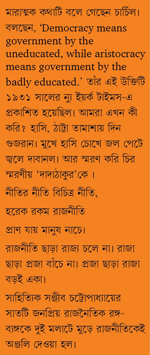 মারাত্মক কথাটি বলে গেছেন চার্চিল। বলছেন, 'Democracy means government by the uneducated, while aristocracy means government by the badly educated.' তাঁর এই উক্তিটি ১৯৩১ সালের ন্যু ইয়র্ক টাইমস-এ প্রকাশিত হয়েছিল। আমরা এখন কী করি? হাসি, ঠাট্টা তামাশায় দিন গুজরান। মুখে হাসি চোখে জল পেটে জ্বলে দাবানল। আর স্মরণ করি চির স্মরণীয় 'দাদাঠাকুর'কে। নীতির নীতি বিচিত্র নীতি, হরেক রকম রাজনীতি প্রাণ যায় মানুষ নাচে। রাজনীতি ছাড়া রাজ্য চলে না। রাজা ছাড়া প্রজা বাঁচে না। প্রজা ছাড়া রাজা বড়ই একা।সাহিত্যিক সঞ্জীব চট্টোপাধ্যায়ের সাতটি জনপ্রিয় রাজনৈতিক রঙ্গ-ব্যঙ্গকে দুই মলাটে মুড়ে রাজনীতিকেই অঞ্জলি দেওয়া হল।