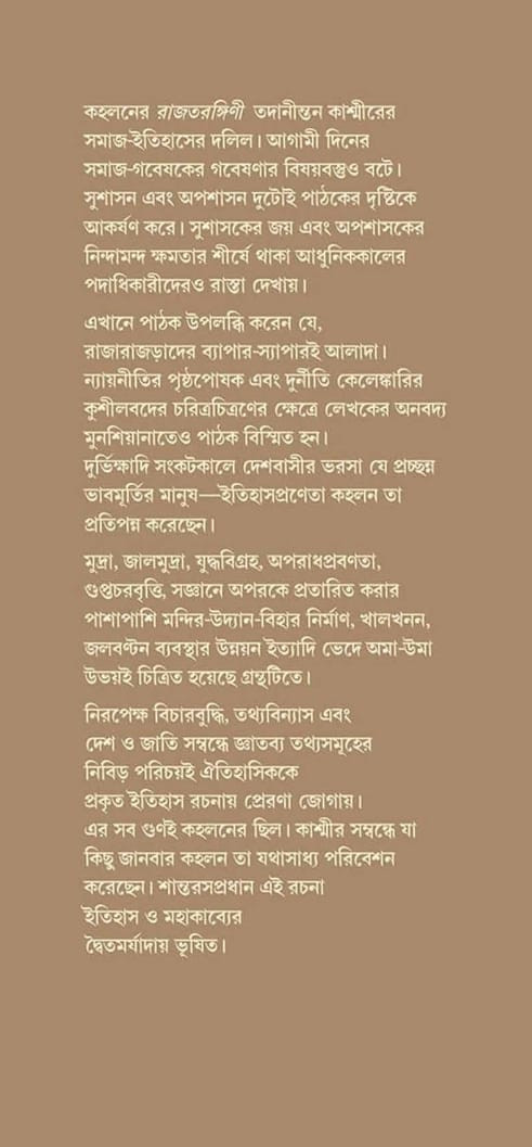 এখানে পাঠক উপলব্ধি করেন যে, রাজারাজড়াদের ব্যাপার-স্যাপারই আলাদা। ন্যায়নীতির পৃষ্ঠপোষক এবং দুর্নীতি কেলেঙ্কারির কুশীলবদের চরিত্রচিত্রণের ক্ষেত্রে লেখকের অনবদ্য মুনশিয়ানাতেও পাঠক বিস্মিত হন। দুর্ভিক্ষাদি সংকটকালে দেশবাসীর ভরসা যে প্রচ্ছন্ন ভাবমূর্তির মানুষ-ইতিহাসপ্রণেতা কহলন তা প্রতিপন্ন করেছেন।