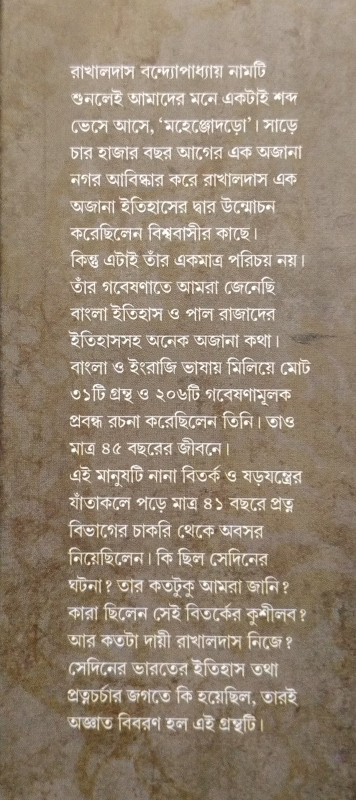 রাখালদাস বন্দ্যোপাধ্যায় নামটি শুনলেই আমাদের মনে একটাই শব্দ ভেসে আসে, 'মহেঞ্জোদড়ো'। সাড়ে চার হাজার বছর আগের এক অজানা নগর আবিষ্কার করে রাখালদাস এক অজানা ইতিহাসের দ্বার উন্মোচন করেছিলেন বিশ্ববাসীর কাছে। কিন্তু এটাই তাঁর একমাত্র পরিচয় নয়। তাঁর গবেষণাতে আমরা জেনেছি বাংলা ইতিহাস ও পাল রাজাদের ইতিহাসসহ অনেক অজানা কথা। বাংলা ও ইংরাজি ভাষায় মিলিয়ে মোট ৩১টি গ্রন্থ ও ২০৬টি গবেষণামূলক প্রবন্ধ রচনা করেছিলেন তিনি। তাও মাত্র ৪৫ বছরের জীবনে। এই মানুষটি নানা বিতর্ক ও ষড়যন্ত্রের যাঁতাকলে পড়ে মাত্র ৪১ বছরে প্রত্ন বিভাগের চাকরি থেকে অবসর নিয়েছিলেন। কি ছিল সেদিনের ঘটনা? তার কতটুকু আমরা জানি? কারা ছিলেন সেই বিতর্কের কুশীলব? আর কতটা দায়ী রাখালদাস নিজে? সেদিনের ভারতের ইতিহাস তথা প্রত্নচর্চার জগতে কি হয়েছিল, তারই অজ্ঞাত বিবরণ হল এই গ্রন্থটি।