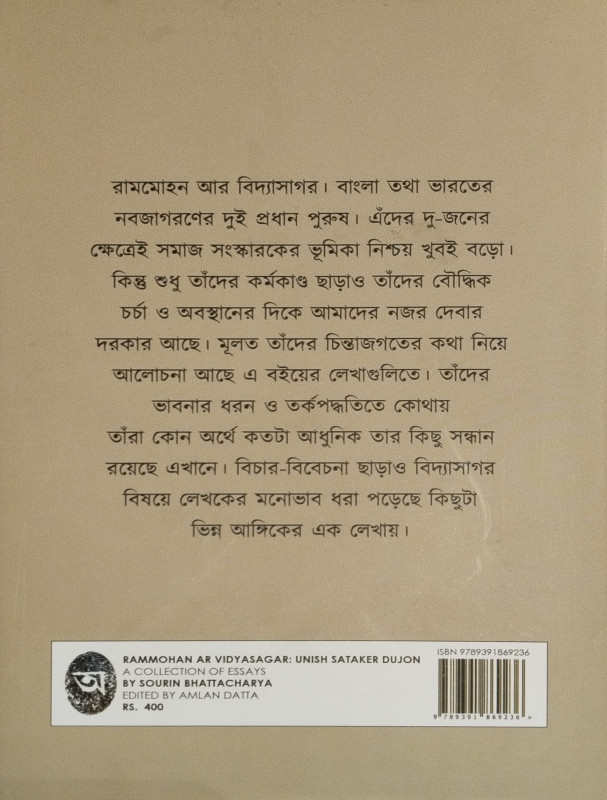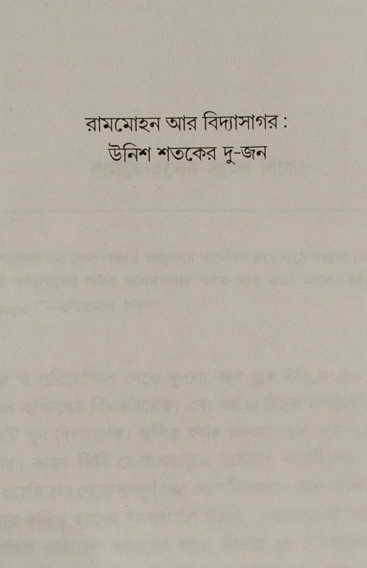 রামমোহন আর বিদ্যাসাগর। বাংলা তথা ভারতের নবজাগরণের দুই প্রধান পুরুষ। এঁদের দু-জনের ক্ষেত্রেই সমাজ সংস্কারকের ভূমিকা নিশ্চয় খুবই বড়ো। কিন্তু শুধু তাঁদের কর্মকাণ্ড ছাড়াও তাঁদের বৌদ্ধিক চর্চা ও অবস্থানের দিকে আমাদের নজর দেবার দরকার আছে। মূলত তাঁদের চিন্তাজগতের কথা নিয়ে আলোচনা আছে এ বইয়ের লেখাগুলিতে। তাঁদের ভাবনার ধরন ও তর্কপদ্ধতিতে কোথায় তাঁরা কোন অর্থে কতটা আধুনিক তার কিছু সন্ধান রয়েছে এখানে। বিচার-বিবেচনা ছাড়াও বিদ্যাসাগর বিষয়ে লেখকের মনোভাব ধরা পড়েছে কিছুটা ভিন্ন আঙ্গিকের এক লেখায়।