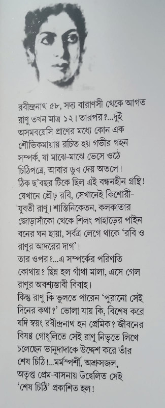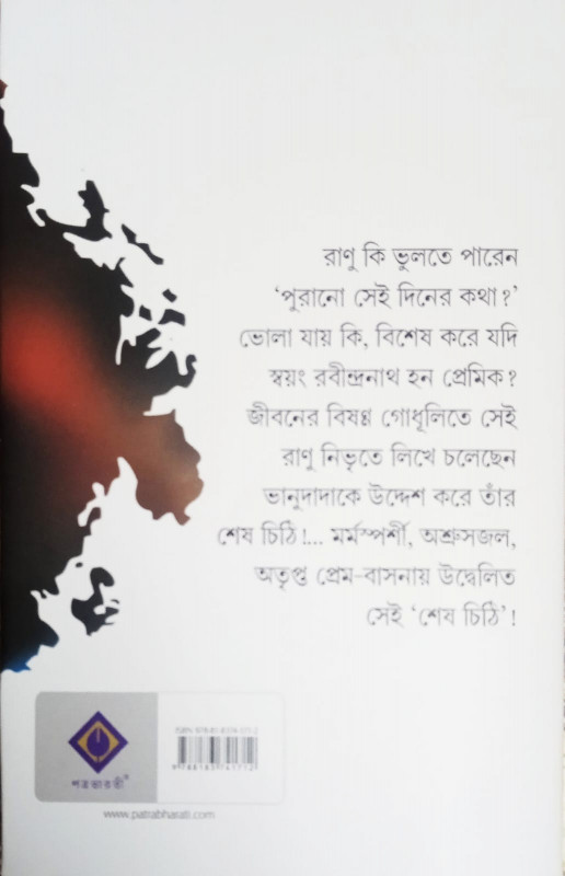 কিন্তু রাণু কি ভুলতে পারেন 'পুরানো সেই দিনের কথা?' ভোলা যায় কি, বিশেষ করে যদি স্বয়ং রবীন্দ্রনাথ হন প্রেমিক? জীবনের বিষণ্ণ গোধূলিতে সেই রাণু নিভৃতে লিখে চলেছেন ভানুদাদাকে উদ্দেশ করে তাঁর শেষ চিঠি।... মর্মস্পর্শী, অশ্রুসজল, অতৃপ্ত প্রেম-বাসনায় উদ্বেলিত সেই 'শেষ চিঠি' প্রকাশিত হল!