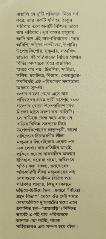 ওপার বাংলা থেকে এসে রায় পরিবারের প্রথম স্থায়ী বাসগৃহ ১০০ গড়পার রোডে উপেন্দ্রকিশোরের নিজের হাতে নক্শা করা বাড়িটি। সে-বাড়িকে কেন্দ্র করে এবং সে- বাড়ির বিভিন্ন সদস্যকে নিয়ে উপেন্দ্রকিশোরের ভ্রাতুষ্পুত্রী, বাংলা সাহিত্যের চিরস্মরণীয় লীলা মজুমদার লিখেছিলেন একের-পর- এক লেখা। যার প্রতিটির মধ্যেই লুকিয়ে রয়েছে রায়বাড়ির অজানা ইতিহাস, ঘরোয়া গপ্পো, ব্যক্তিগত স্মৃতি। বলা বাহুল্য, রসবোধের অধিকারিণী লীলা মজুমদারের এই লেখাগুলো অ্যাদ্দিন বিভিন্ন পত্র- পত্রিকার পাতায়, কিছু সংকলনে ছড়িয়ে-ছিটিয়ে ছিল। এবারে 'বিচিত্রা গ্রন্থন বিভাগ' থেকে ওঁর সেই সমস্ত লেখাগুলিকে দু'মলাটের মধ্যে এনে প্রকাশিত হল- 'রায়বাড়ি'। নিশ্চিত ভাবেই এ-বই রায় পরিবারকে জানতে তো বটেই, বাংলা সাহিত্যেরও এক সম্পদ হয়ে রইল।