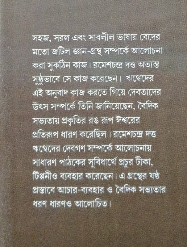 সহজ, সরল এবং সাবলীল ভাষায় বেদের মতো জটিল জ্ঞান-গ্রন্থ সম্পর্কে আলোচনা করা সুকঠিন কাজ। রমেশচন্দ্র দত্ত অত্যন্ত সুষ্ঠুভাবে সে কাজ করেছেন। ঋগ্বেদের এই অনুবাদ কাজ করতে গিয়ে দেবতাদের উৎস সম্পর্কে তিনি জানিয়েছেন, বৈদিক সভ্যতায় প্রকৃতির রঙ রূপ ঈশ্বরের প্রতিরূপ ধারণ করেছিল। রমেশচন্দ্র দত্ত ঋগ্বেদের দেবগণ সম্পর্কে আলোচনায় সাধারণ পাঠকের সুবিধার্থে প্রচুর টাকা, টিপ্পনীও ব্যবহার করেছেন। এ গ্রন্থের ষষ্ঠ প্রস্তাবে আচার-ব্যবহার ও বৈদিক সভ্যতার ধরণ ধারণও আলোচিত।