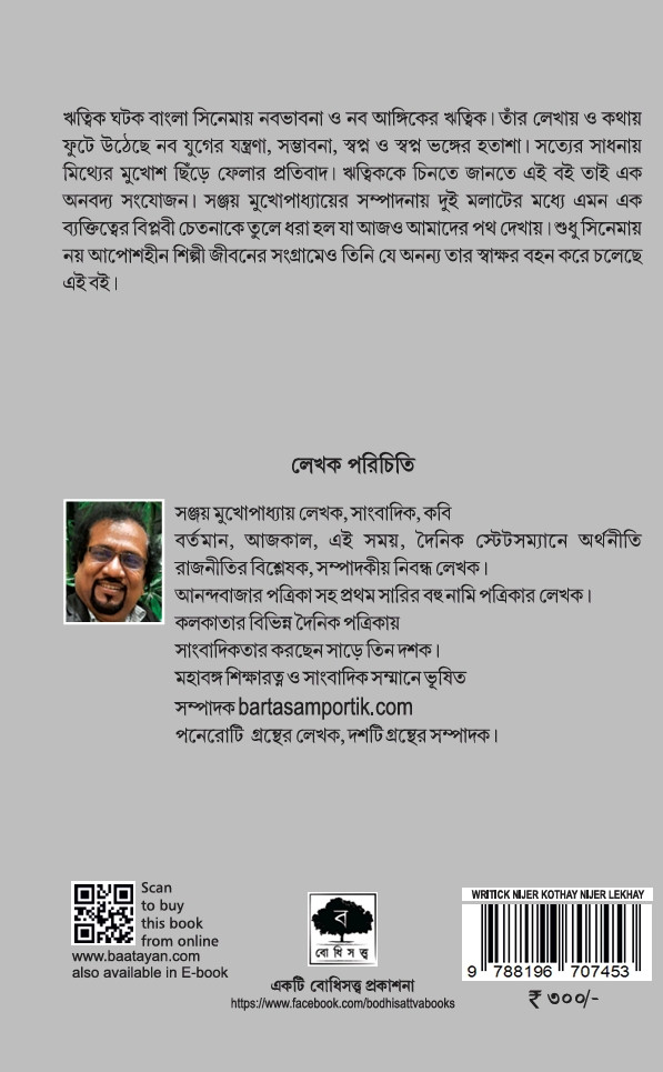 ঋত্বিক ঘটক বাংলা সিনেমায় নবভাবনা ও নব আঙ্গিকের ঋত্বিক। তাঁর লেখায় ও কথায় ফুটে উঠেছে নব যুগের যন্ত্রণা, সম্ভাবনা, স্বপ্ন ও স্বপ্ন ভঙ্গের হতাশা। সত্যের সাধনায় মিথ্যের মুখোশ ছিঁড়ে ফেলার প্রতিবাদ। ঋত্বিককে চিনতে জানতে এই বই তাই এক অনবদ্য সংযোজন। সঞ্জয় মুখোপাধ্যায়ের সম্পাদনায় দুই মলাটের মধ্যে এমন এক ব্যক্তিত্বের বিপ্লবী চেতনাকে তুলে ধরা হল যা আজও আমাদের পথ দেখায়। শুধু সিনেমায় নয় আপোশহীন শিল্পী জীবনের সংগ্রামেও তিনি যে অনন্য তার স্বাক্ষর বহন করে চলেছে এই বই।