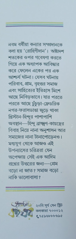 নবম বর্ষীয়া কন্যার সম্প্রদানকে বলা হয় ‘রোহিণীদান’৷ অষ্টাদশ শতকের ওপর গবেষণা করতে গিয়ে এক অধ্যাপক আবিষ্কার করে ফেলেন একের পর এক আশ্চর্য ঘটনা৷ যেসব ঘটনায় পরিবার গ্রাম বৃহত্তর সমাজ এবং সাহিত্যের ইতিহাস মিশে আছে নিবিডভাবে৷ যার পরতে পরতে আছে চুঁচুডা–ফ্রেডরিক নগর–ফরাসডাঙা জুডে থাকা খ্রিস্টান–হিন্দুর পাশাপাশি অবস্থান–––হিন্দু ব্রাক্ষ্মণ–কায়স্থের বিবাহ নিয়ে নানা অনুশাসন আর সমাজের নানা টানাপোডেনও৷ মধ্যযুগ থেকে আজও এই উপন্যাসের চরিত্রেরা যেন অপেক্ষায় সেই এক আদিম প্রশ্ণের উত্তরের জন্য–––প্রেম বডো না জাত? সমাজ বডো নাকি ভালোবাসা?