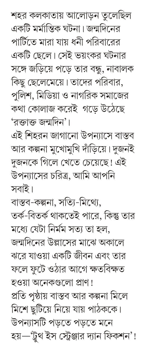এই শিহরন জাগানো উপন্যাসে বাস্তব আর কল্পনা মুখোমুখি দাঁড়িয়ে৷ দুজনই দুজনকে গিলে খেতে চেয়েছে! এই উপন্যাসের চরিত্র, আমি আপনি সবাই। বাস্তব-কল্পনা, সত্যি-মিথ্যে, তর্ক-বিতর্ক থাকতেই পারে, কিন্তু তার মধ্যে যেটা নিৰ্মম সত্য তা হল, জন্মদিনের উল্লাসের মাঝে অকালে ঝরে যাওয়া একটি জীবন এবং তার ফলে ফুটে ওঠার আগে ক্ষতবিক্ষত হওয়া অনেকগুলো প্রাণ! প্রতি পৃষ্ঠায় বাস্তব আর কল্পনা মিলে মিশে ছুটিয়ে নিয়ে যায় পাঠককে।