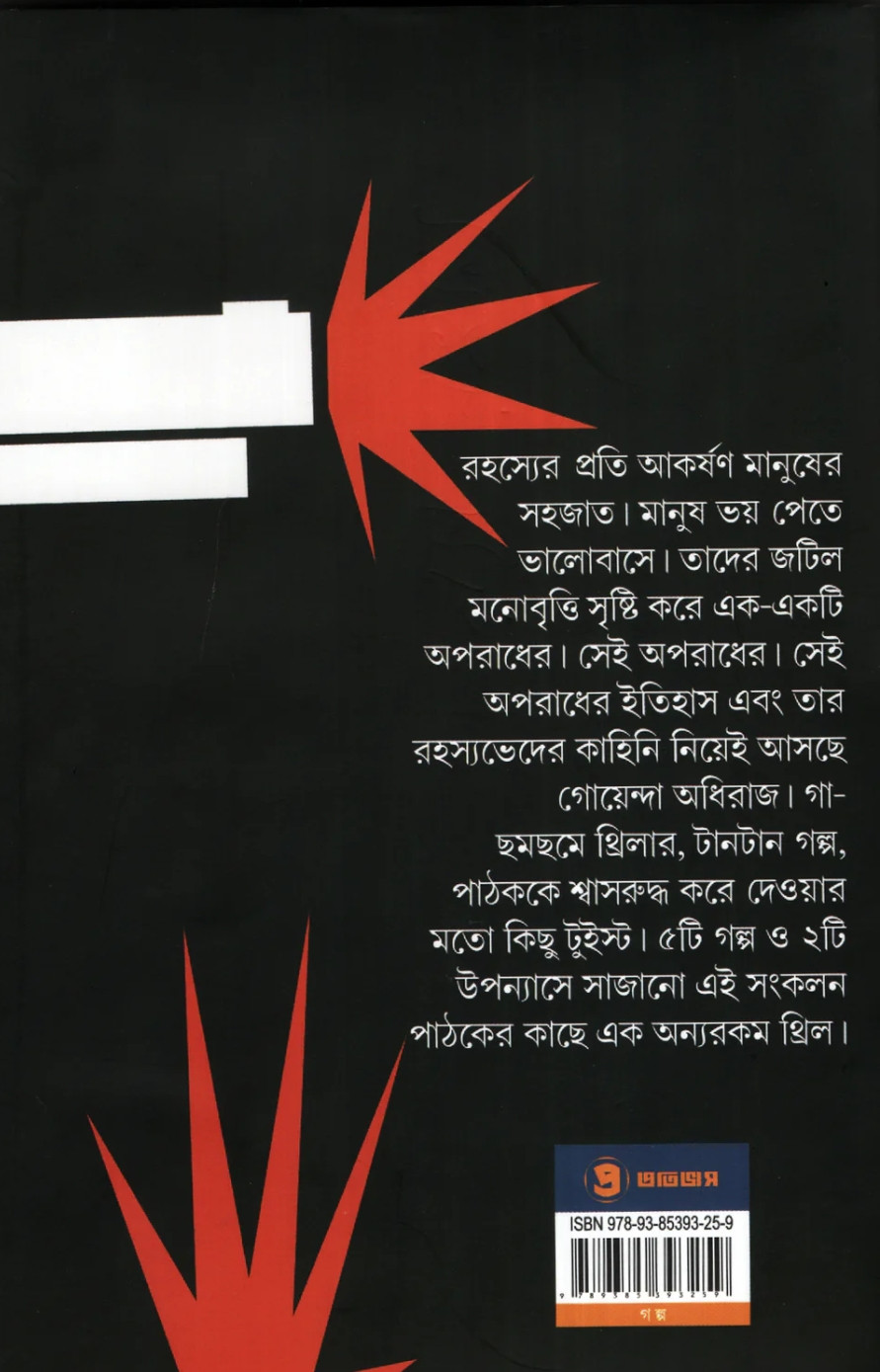 রহস্য আর আতঙ্ক বাঙালির চিরদিনের প্রিয় বিষয়৷ গা ছমছমে বর্ষার রাতে, প্রদীপের কাঁপা কাঁপা ছায়া ছায়া আলোয়, ঠাকুমার মুখে ভূত, দৈত্য, দানোর গল্প থেকে আতঙ্কের স্বাদ পেতে শুরু করে বাঙালির শৈশব। এরপর আসে থ্রিলার। রক্ত জমাট করা শিহরনের স্বাদে মাতে তারা। আর এই দুই স্বাদ কখনোই ভোলা যায় না৷ ভোলবার নয়। এই সংকলনটিতে তাই যেমন রয়েছে হাড় হিম করা আতঙ্ক, পাশাপাশি রয়েছে রহস্য গল্পের গোলকধাঁধা। সেই আদি ও অকৃত্রিম প্রশ্ন— কে? কেন? আর এই প্রশ্নেরই উত্তর খুঁজে বেড়ায় গোয়েন্দা অধিরাজ। সে কোনও সখের গোয়েন্দা নয়, তার অনুসন্ধিৎসু মন তাঁকে এনে ফেলেছে রহস্যসন্ধানীর পেশায়। অনাবিল দক্ষতায় সে একের-পর- এক খুলে চলে রহস্যের জট। সেই সন্ধানের পথে নেমে পড়ে পাঠকেরাও। অধিরাজের সঙ্গে সঙ্গে তারাও ভাবতে থাকেন— কে? এবং কেন ?