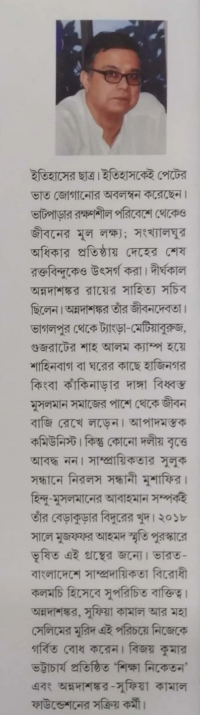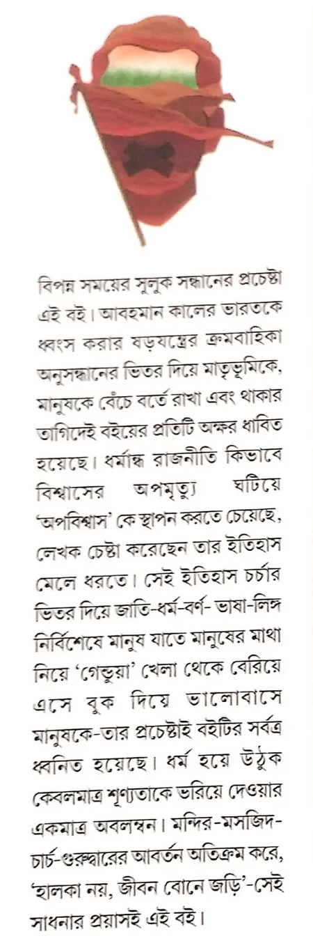বিপন্ন সময়ের সুলুক সন্ধানের প্রচেষ্টা এই বই। আবহমান কালের ভারতকে ধ্বংস করার ষড়যন্ত্রের ক্রমবাহিকা অনুসন্ধানের ভিতর দিয়ে মাতৃভূমিকে, মানুষকে বেঁচে বর্তে রাখা এবং থাকার তাগিদেই বইয়ের প্রতিটি অক্ষর ধাবিত হয়েছে। ধর্মান্ধ রাজনীতি কিভাবে বিশ্বাসের অপমৃত্যু ঘটিয়ে 'অপবিশ্বাস' কে স্থাপন করতে চেয়েছে, লেখক চেষ্টা করেছেন তার ইতিহাস মেলে ধরতে। সেই ইতিহাস চর্চার ভিতর দিয়ে জাতি-ধর্ম-বর্ণ-ভাষা-লিঙ্গ নির্বিশেষে মানুষ যাতে মানুষের মাথা নিয়ে 'গেন্ডুয়া' খেলা থেকে বেরিয়ে এসে বুক দিয়ে ভালোবাসে মানুষকে-তার প্রচেষ্টাই বইটির সর্বত্র ধ্বনিত হয়েছে। ধর্ম হয়ে উঠুক কেবলমাত্র শূণ্যতাকে ভরিয়ে দেওয়ার একমাত্র অবলম্বন। মন্দির-মসজিদ- চার্চ-গুরুদ্বারের আবর্তন অতিক্রম করে, 'হালকা নয়, জীবন বোনে জড়ি'-সেই সাধনার প্রয়াসই এই বই।