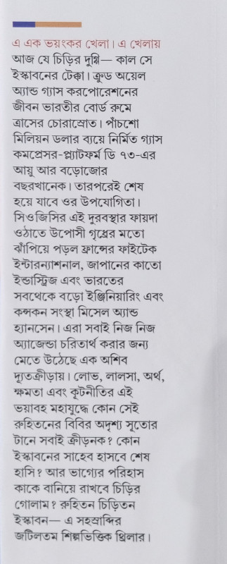 এ এক ভয়ংকর খেলা। এ খেলায় আজ যে চিড়ির দুগ্গি – কাল সে ইস্কাবনের টেক্কা। ক্রুড অয়েল অ্যান্ড গ্যাস করপোরেশনের জীবন ভারতীর বোর্ড রুমে ত্রাসের চোরাস্রোত। পাঁচশো মিলিয়ন ডলার ব্যয়ে নির্মিত গ্যাস কমপ্রেসর-প্ল্যাটফর্ম ডি ৭৩-এর আয়ু আর বড়োজোর বছরখানেক। তারপরেই শেষ হয়ে যাবে ওর উপযোগিতা। সিওজিসির এই দুরবস্থার ফায়দা ওঠাতে উপোসী গৃধ্রের মতো ঝাঁপিয়ে পড়ল ফ্রান্সের ফাইটেক ইন্টারন্যাশনাল, জাপানের কাতো ইন্ডাস্ট্রিজ এবং ভারতের সবথেকে বড়ো ইঞ্জিনিয়ারিং এবং কন্সকন সংস্থা মিসেল অ্যান্ড হ্যানসেন। এরা সবাই নিজ নিজ অ্যাজেন্ডা চরিতার্থ করার জন্য মেতে উঠেছে এক অশিব দ্যূতক্রীড়ায়। লোভ, লালসা, অর্থ, ক্ষমতা এবং কূটনীতির এই ভয়াবহ মহাযুদ্ধে কোন সেই রুহিতনের বিবির অদৃশ্য সূতোর টানে সবাই ক্রীড়নক? কোন ইস্কাবনের সাহেব হাসবে শেষ হাসি? আর ভাগ্যের পরিহাস কাকে বানিয়ে রাখবে চিড়ির গোলাম? রুহিতন চিড়িতন ইস্কাবন— এ সহস্রাব্দির জটিলতম শিল্পভিত্তিক থ্রিলার।