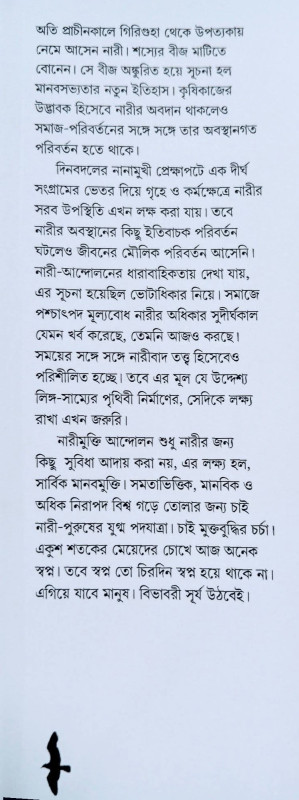 নারীমুক্তি আন্দোলন শুধু নারীর জন্য কিছু সুবিধা আদায় করা নয়, এর লক্ষ্য হল, সার্বিক মানবমুক্তি। সমতাভিত্তিক, মানবিক ও অধিক নিরাপদ বিশ্ব গড়ে তোলার জন্য চাই নারী-পুরুষের যুগ্ম পদযাত্রা। চাই মুক্তবুদ্ধির চর্চা। একুশ শতকের মেয়েদের চোখে আজ অনেক স্বপ্ন। তবে স্বপ্ন তো চিরদিন স্বপ্ন হয়ে থাকে না। এগিয়ে যাবে মানুষ। বিভাবরী সূর্য উঠবেই।