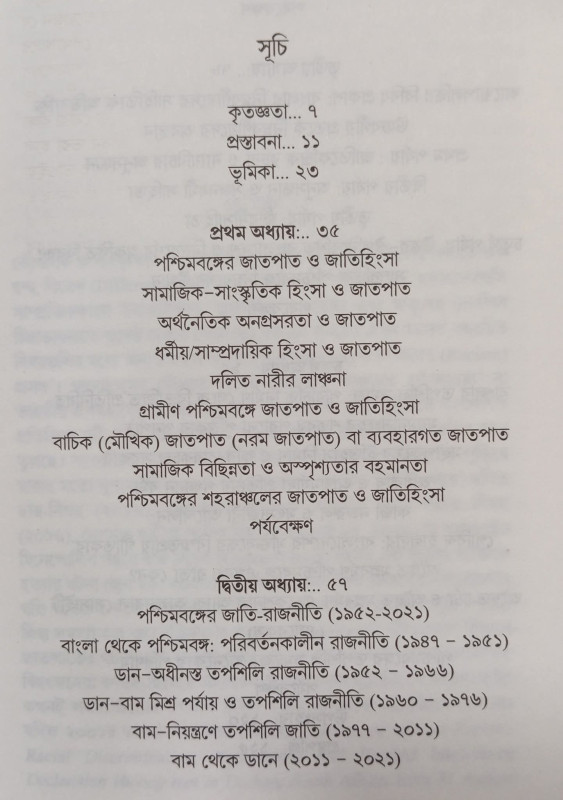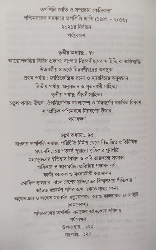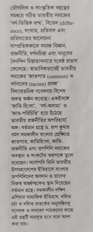 ভৌগলিক ও সাংস্কৃতিক বহুত্বের সমন্বয়ে গঠিত ভারতীয় সমাজের 'বর্ণ-ভিত্তিক দ্বন্দ্ব', বিভেদ (differ-ence), সংঘাত, প্রতিবাদ এবং প্রতিঘাতের আলোচনা সাম্প্রতিককালে সমাজ বিজ্ঞান, রাজনীতি, দর্শনচিন্তা এবং মানুষের দৈনন্দিন চিন্তাভাবনাতে যথেষ্ঠ প্রভাব ফেলেছে। স্বাভাবিকভাবেই ভারতীয় সমাজের 'জাতপাত (casteism) ও বর্ণবাদের (racism) প্রসঙ্গ' বিদ্যায়তনিক গবেষণায় বিশেষ গুরুত্ব অর্জন করেছে। একইসঙ্গে 'জাতি-হিংসা', 'বর্ণ-অসাম্য' ও 'জাত-পরিচিতি' হয়ে উঠেছে ভারতীয় রাজনীতির অপরিহার্য্য অঙ্গ। বর্তমান গ্রন্থে ড. রূপ কুমার বর্মণ সমকালীন বাংলার প্রেক্ষিতে জাতপাত, জাতিহিংসা, জাতি-রাজনীতি এবং তপশিলি সমাজের অবস্থান ও সংকটের স্বরূপকে তুলে ধরেছেন। সর্বোপরি তিনি ভারতীয় উপমহাদেশের ইতিহাসে বাংলার তপশিলিদের অবদান ও তাদের নিজস্ব অন্তর্দ্বন্দ্বকেও স্থান দিয়েছেন বর্তমান গ্রন্থে। সমকালীন দক্ষিণ এশিয়ার সামাজিক ইতিহাস, দলিত চর্চা ও দলিত প্রতর্কের অনুসন্ধিৎসু গবেষক ও সাধারণ পাঠকদের কাছে এই গ্রন্থটি সমাদৃত হবে বলে আশা করা যায়।