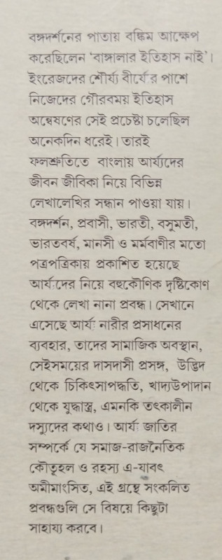 বঙ্গদর্শনের পাতায় বঙ্কিম আক্ষেপ করেছিলেন 'বাঙ্গালার ইতিহাস নাই'। ইংরেজদের শৌর্য্য বীর্যের পাশে নিজেদের গৌরবময় ইতিহাস অন্বেষণের সেই প্রচেষ্টা চলেছিল অনেকদিন ধরেই। তারই ফলশ্রুতিতে বাংলায় আর্য্যদের জীবন জীবিকা নিয়ে বিভিন্ন লেখালেখির সন্ধান পাওয়া যায়। বঙ্গদর্শন, প্রবাসী, ভারতী, বসুমতী, ভারতবর্ষ, মানসী ও মর্মবাণীর মতো পত্রপত্রিকায় প্রকাশিত হয়েছে আর্যদের নিয়ে বহুকৌণিক দৃষ্টিকোণ থেকে লেখা নানা প্রবন্ধ। সেখানে এসেছে আর্যা নারীর প্রসাধনের ব্যবহার, তাদের সামাজিক অবস্থান, সেইসময়ের দাসদাসী প্রসঙ্গ, উদ্ভিদ থেকে চিকিৎসাপদ্ধতি, খাদ্যউপাদান থেকে যুদ্ধাস্ত্র, এমনকি তৎকালীন দস্যুদের কথাও। আর্য জাতির সম্পর্কে যে সমাজ-রাজনৈতিক কৌতূহল ও রহস্য এ-যাবৎ অমীমাংসিত, এই গ্রন্থে সংকলিত প্রবন্ধগুলি সে বিষয়ে কিছুটা সাহায্য করবে।