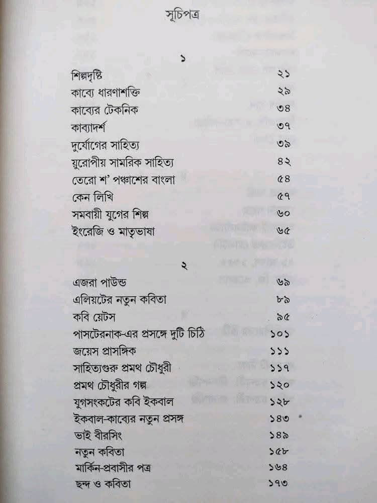 প্রথম পর্ব, মূলত কবিতা, শিল্পদৃষ্টি, কাব্যে ধারণাশক্তিকবিতার ফর্ম, কাব্যের টেকনিক, কাব্যাদর্শ,কেন লিখি এছাড়াও সমবায়ী যুগের শিল্প, তেরোশো পঞ্চাশের বাংলা, দুর্যোগের সাহিত্য, ইউরোপীয় সামরিক সাহিত্য, ইংরেজি ও মাতৃভাষা এমন কবিতা বিষয়ক ও নানা সাহিত্যে বিষয় নিয়ে।