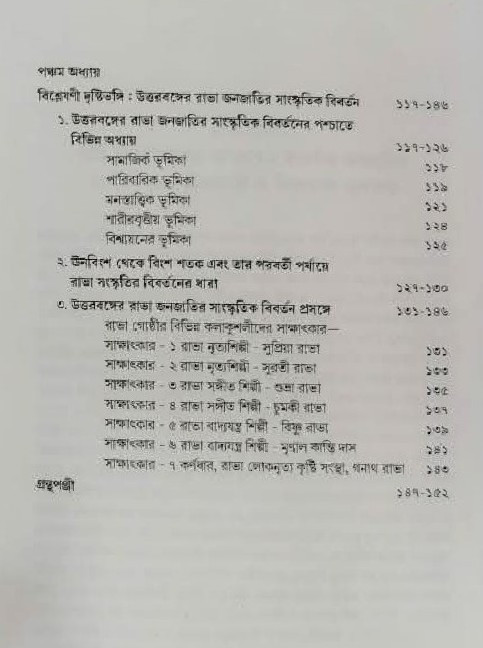 ইতিহাসের ধারা অনুসারে মানবসভ্যতা ক্রমাগত পরিবর্তনশীল এবং বিবর্তনশীল। এই বিবর্তন ও পরিবর্তনের পথ অনুসরণ করে ভারতবর্ষের বিভিন্ন প্রান্তীয় জনজাতির বির্বতনের আলোকে সুপ্রকাশ ঘটেছে। উত্তরবঙ্গের জলপাইগুড়ি এবং আলিপুরদুয়ার জেলার রাভা জনজাতি তেমনই এক জ্বলন্ত দৃষ্টান্ত। এই গ্রন্থটিতে উনবিংশ থেকে বিংশ শতাব্দীতে রাভা জনজাতির সাংস্কৃতিক বিবর্তনকে তুলে ধরা হয়েছে। জলপাইগুড়ি এবং আলিপুরদুয়ার জেলার বিভিন্ন প্রান্তীয় অঞ্চলে এই জনগোষ্ঠীর পারিবারিক, জীবনযাত্রার সার্বিক পরিচয় এবং সর্বোপরি ক্ষেত্রসমীক্ষার মাধ্যমে উক্ত সময় সুচির অধীনে বিপুল সাংস্কৃতিক ভাণ্ডার সমৃদ্ধ রাভা জনজাতির কৃষ্টির উন্নয়ন ও বিবর্তন ধারাকে পাঠকমণ্ডলীর কাছে তুলে ধরার প্রয়াস করা হয়েছে এই গ্রন্থে।