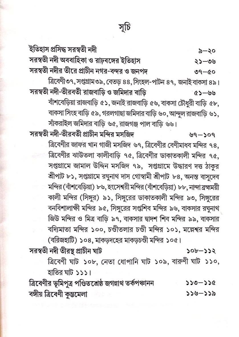 তরঙ্গ উচ্ছ্বসিত বেগবতী সরস্বতীকে কেন্দ্র করে রাঢ়বঙ্গে গড়ে উঠেছিল সমৃদ্ধ জনপদ, বাণিজ্য-বন্দর, নগর- সভ্যতা। সুপ্রাচীনকাল থেকে মধ্যযুগ পর্যন্ত যার গৌরব অক্ষুণ্ণ ছিল। বর্তমানে লুপ্তপ্রায় নদীর বাঁকে-বাঁকে রয়েছে ইতিহাসের নানা সাক্ষ্য। সরস্বতীর গতিপ্রকৃতি, নদী অববাহিকা তথা রাঢ়বঙ্গের ভৌগোলিক ও ঐতিহাসিক প্রেক্ষাপট চিত্রিত হয়েছে এই গ্রন্থে। নদী তীরে নির্মিত হয়েছিল অজস্র স্থাপত্যশিল্প, তার অনেক নিদর্শন কালের প্রবাহে ধ্বংসপ্রাপ্ত। প্রাচীন মহিমা বুকে নিয়ে আজও কিছু স্থাপত্য বিদ্যমান। সেই সকল পুরাকীর্তি তুলে ধরা হয়েছে এখানে। ঔপনিবেশিক আমলের জাঁকজমকপূর্ণ জমিদার বাড়ির কাহিনীও লিপিবদ্ধ হয়েছে। তুলে আনা হয়েছে বিস্মৃতপ্রায় অষ্টাদশ শতকের পণ্ডিতশ্রেষ্ঠ জগন্নাথ তর্কপঞ্চাননের জীবনালেখ্য। আধ্যাত্মিকতার মিলনক্ষেত্র ত্রিবেণী সঙ্গমের সুপ্রাচীন ঐতিহ্যকে নতুন গরিমায় মহিমান্বিত করে তুলেছে বঙ্গীয় কুম্ভমেলা।
