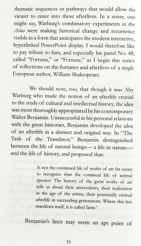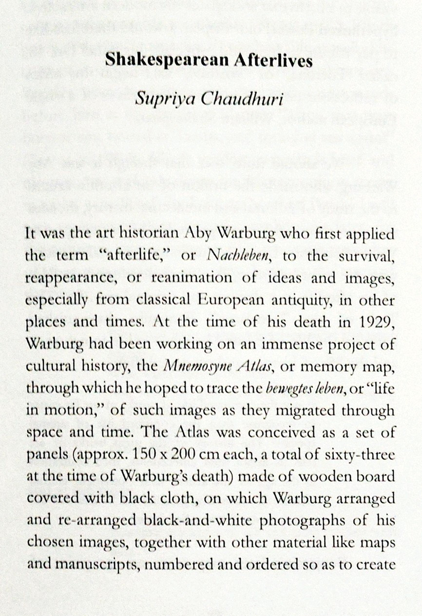 It was the art historian Aby Warburg who first applied the term "afterlife," or Nachleben, to the survival, reappearance, or reanimation of ideas and images, especially from classical European antiquity, in other places and times. At the time of his death in 1929, Warburg had been working on an immense project of cultural history, the Mnemosyne Atlas, or memory map, through which he hoped to trace the bewegtes leben, or "life in motion," of such images as they migrated through space and time. The Atlas was conceived as a set of panels (approx. 150 x 200 cm each, a total of sixty-three at the time of Warburg's death) made of wooden board covered with black cloth, on which Warburg arranged and re-arranged black-and-white photographs of his chosen images, together with other material like maps and manuscripts, numbered and ordered so as to create