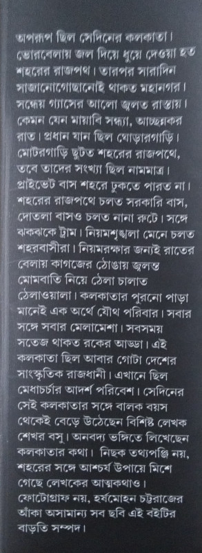 সেদিনের সেই কলকাতার সঙ্গে বালক বয়স থেকেই বেড়ে উঠেছেন বিশিষ্ট লেখক শেখর বসু। অনবদ্য ভঙ্গিতে লিখেছেন কলকাতার কথা। নিছক তথ্যপঞ্জি নয়, শহরের সঙ্গে আশ্চর্য উপায়ে মিশে গেছে লেখকের আত্মকথাও। ফোটোগ্রাফ নয়, বিশিষ্ট শিল্পী হর্ষমোহন চট্টরাজের আঁকা অসামান্য সব ছবি এই বইটির বাড়তি সম্পদ।