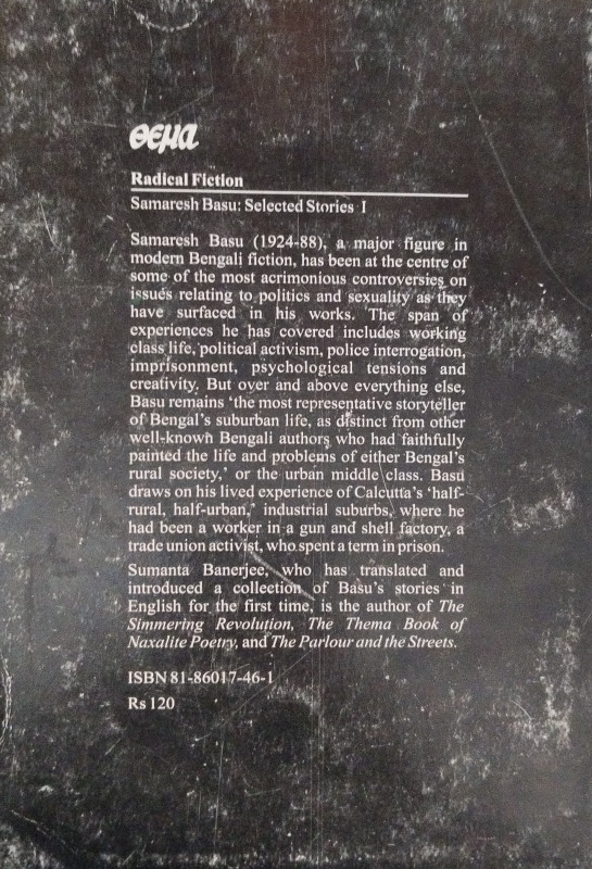 Samaresh Basu (1924-88), a major figure in modern Bengali fiction, has been at the centre of some of the most acrimonious controversies on issués relating to politics and sexuality as they have surfaced in his works. The span of experiences he has covered includes working class life, political activism, police interrogation, imprisonment, psychological tensions and creativity. But over and above everything else, Basu remains 'the most representative storyteller of Bengal's suburban life, as distinct from other well-known Bengali authors who had faithfully painted the life and problems of either Bengal's rural society, or the urban middle class. Basu draws on his lived experience of Calcutta's "half- rural, half-urban," industrial suburbs, where he had been a worker in a gun and shell factory, a trade union activist, who spent a term in prison.