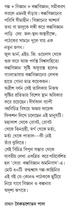সেই বিচিত্র বিপুল সম্ভার থেকে যাবতীয় লেখা একত্রিত করে পরিবেশিত হল ‘সেরা কল্পবিজ্ঞান অমনিবাস’-এ। মোট ৩০টি রুদ্ধশ্বাস গল্প-কাহিনির এই বই যে-কোনও পাঠককে ছুটিয়ে নিয়ে যাবে বিজ্ঞান ও কল্পনার অদৃশ্য জগতে।
