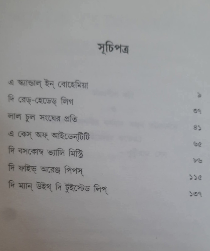 বইয়ের প্রচ্ছদের লেখাটি পৃথ্বীরাজ সেনের লেখা " শার্লক হোমস স্টোরিজ " হিসেবে অনুবাদ করা হয়েছে। বইটি পৃথ্বীরাজ সেনের বাংলায় অনুবাদ করা শার্লক হোমসের গল্পের একটি সংগ্রহ। শার্লক হোমস হলেন স্কটিশ লেখক স্যার আর্থার কোনান ডয়েলের তৈরি একজন কাল্পনিক গোয়েন্দা। চরিত্রটির পদ্ধতিগুলি এডিনবার্গ মেডিকেল স্কুল বিশ্ববিদ্যালয়ের ডয়েলের অধ্যাপক ডক্টর জোসেফ বেল দ্বারা অনুপ্রাণিত হয়েছিল।