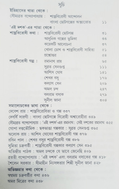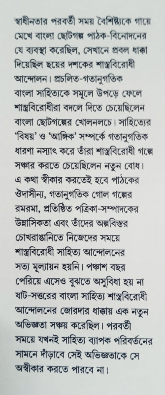 স্বাধীনতার পরবর্তী সময় বৈশিষ্ট্যকে গায়ে মেখে বাংলা ছোটগল্প পাঠক-বিনোদনের যে ব্যবস্থা করেছিল, সেখানে প্রবল ধাক্কা দিয়েছিল ছয়ের দশকের শাস্ত্রবিরোধী আন্দোলন। প্রচলিত-গতানুগতিক বাংলা সাহিত্যকে সমূলে উপড়ে ফেলে শাস্ত্রবিরোধীরা বদলে দিতে চেয়েছিলেন বাংলা ছোটগল্পের খোলনলচে। সাহিত্যের 'বিষয়' ও 'আঙ্গিক' সম্পর্কে গতানুগতিক ধারণা নস্যাৎ করে তাঁরা শাস্ত্রবিরোধী গল্পে সঞ্চার করতে চেয়েছিলেন নতুন বোধ। এ কথা স্বীকার করতেই হবে পাঠকের ঔদাসীন্য, গতানুগতিক গোল গল্পের রমরমা, প্রতিষ্ঠিত পত্রিকা-সম্পাদকের উন্নাসিকতা এবং তাঁদের অল্পবিস্তর চোখরাঙানিতে নিজেদের সময়ে শাস্ত্রবিরোধী সাহিত্য আন্দোলনের সত্য মূল্যায়ন হয়নি। পঞ্চাশ বছর পেরিয়ে এসেও বুঝতে অসুবিধা হয় না ষাট-সত্তরের বাংলা সাহিত্য শাস্ত্রবিরোধী আন্দোলনের জোরদার ধাক্কায় এক নতুন অভিজ্ঞতা সঞ্চয় করেছিল। পরবর্তী সময়ে যখনই সাহিত্য ব্যাপক পরিবর্তনের সামনে দাঁড়াবে সেই অভিজ্ঞতাকে সে অস্বীকার করতে পারবে না।