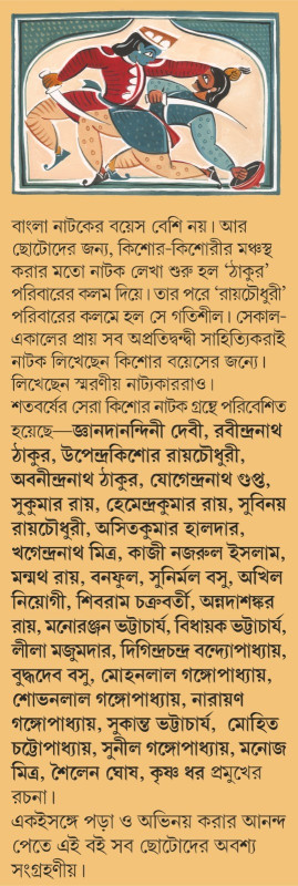 বাংলা নাটকের বয়েস বেশি নয়। আর ছোটোদের জন্য, কিশোর-কিশোরীর মঞ্চস্থ করার মতো নাটক লেখা শুরু হল 'ঠাকুর' পরিবারের কলম দিয়ে। তার পরে 'রায়চৌধুরী' পরিবারের কলমে হল সে গতিশীল। সেকাল-একালের প্রায় সব অপ্রতিদ্বন্দ্বী সাহিত্যিকরাই নাটক লিখেছেন কিশোর বয়েসের জন্যে।