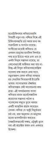 সংগীতের মতোই কবিতাও যে একজন মানুষের মানসিক বিপর্যয়ে পথ্য হয়ে উঠতে পারে এবং এর যে একটা বিপুল সম্ভাবনা রয়েছে, তা কোনোভাবেই অস্বীকার করা যায় না। কিন্তু এই বিপুল কবিতাপণ্যকেন্দ্রিক গবেষণা লক্ষ করলে দেখা যাবে, নমুনাস্বরূপ যেসব কবিতা ব্যাবহাত হয় সেগুলির সিংহভাগই ইংরেজি ভাষার। ব্যালাভাষার ঐশ্বর্যময় কবিতাসম্ভার সেই আলোচনায় প্রায় ব্রাতা। এই সন্দর্ভমালায় বাংলা কবিতার নানান মনোবৈজ্ঞানিক প্রয়োগের সম্ভাবনা পাঠক ও গবেষকের সম্মুখে তুলে ধরবার একটি আন্তরিক প্রয়াস করেছেন লেখক। কবিতা যে শুধুই বিমূর্ততার চর্চা নয়, তার অনুধাবন যে মানুষের মনের ভাবপরিবর্তন করতেও বৈজ্ঞানিকভাবেই সক্ষম, এটুকুই তুলে। বরা এই প্রচেষ্টার প্রধান এবং একমাত্র উদ্দেশ্য।