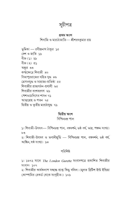 ভারতবর্ষের ইতিহাসে ছত্রপতি শিবাজী মহারাজ ও মারাঠা জাতির অবদান অনস্বীকার্য। বর্তমান গ্রন্থে ধরা পড়েছে মারাঠা জাতির সেই বীরত্বপূর্ণ আখ্যান। মূল গ্রন্থটি শ্রীশরৎকুমার রায়ের বিরচিত, কিন্তু তাতে সংযুক্ত হয়েছে বিপিনচন্দ্র পালের লেখা শিবাজী উৎসব সংক্রান্ত দুটি মনোজ্ঞ প্রবন্ধ। গ্রন্থের মধ্যে কবিগুরু রবীন্দ্রনাথ ঠাকুরের লেখা ভূমিকাটি পাঠকদের বাড়তি প্রাপ্তি, যা একইসঙ্গে বইটির শোভা বৃদ্ধি করেছে। সপ্তদশ শতকে শিবাজীর উত্থান থেকে শুরু করে উনিশ শতকে মারাঠা শক্তির অবক্ষয় পর্যন্ত ঘটনাবলীকে লেখক তুলে ধরেছেন কালিক পরম্পরা মেনে ও তথ্যনিষ্ঠভাবে। সংযুক্ত প্রবন্ধ দুটিতে রচয়িতা জোর দিয়েছেন শিবাজীর ঐক্যমূলক রাষ্ট্রাদর্শের উপর, যা সকলের মান্য হওয়া উচিত বলে তিনি মনে করেন। গ্রন্থটি সাধু ভাষায় রচিত হলেও লেখকের বক্তব্য জটিলতাহীন। বিষয়বস্তুকে তিনি পেশ করেছেন কাহিনীর ছলে যা পাঠককে ইতিহাসের পাশাপাশি সাহিত্যেরও স্বাদ দেবে। পরিশিষ্টে রয়েছে কিছু দুষ্প্রাপ্য সংবাদপত্রের প্রতিবেদন এবং ব্রিটিশ ইস্ট ইন্ডিয়া কোম্পানির রেকর্ডে শিবাজী সংক্রান্ত চিঠিপত্র—যা আগ্রহীদের উৎসাহ জোগাতে সক্ষম।