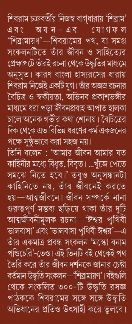 শিবরাম চক্রবর্তীর নিজস্ব বান্ধারায় 'শিব্রাম' এবং অযন এব যোগফল 'শিব্রামায়ণ'-শিবরামের পথ, যা সমগ্র সংকলনটিতে তাঁর জীবন ও সাহিত্যের প্রেক্ষাপটে তাঁরই রচনা থেকে উদ্ধৃতির মাধ্যমে অনুসৃত। কারণ বাংলা হাস্যরসের ধারায় শিবরাম নিজেই একটি যুগ। তাঁর অজস্র রচনার বৈচিত্র ও স্বকীয়তা, অভিনব প্রকাশভঙ্গীর মাধ্যমে ধরা পড়া জীবনপ্রবাহ আপাত হালকা চালে অনেক গভীর কথা শোনায়। বৈচিত্রের দিক থেকে এত বিভিন্ন ধরণের কর্ম একজনের পক্ষে সুষ্ঠুভাবে করা সহজ নয়।