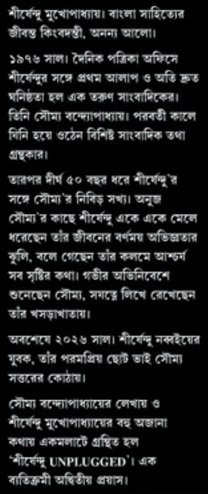 সৌম্য বন্দ্যোপাধ্যায়ের লেখায় ও শীর্ষেন্দু মুখোপাধ্যায়ের বহু অজানা কথায় একমলাটে গ্রন্থিত হল 'শীর্ষেন্দু UNPLUGGED'। এক ব্যতিক্রমী অদ্বিতীয় প্রয়াস।