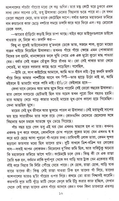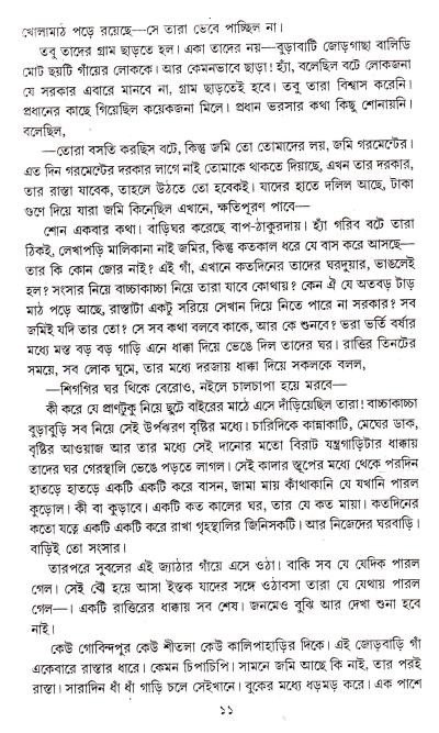 'কী করে যে প্রাণটুকু নিয়ে ছুটে বাইরের মাঠে এসে দাঁড়িয়েছিল তারা। বাচ্চাকাচ্চা বুড়াবুড়ি সব নিয়ে সেই উপর্ঝরণ বৃষ্টির মধ্যে। চারিদিকে কান্নাকাটি, মেঘের ডাক, বৃষ্টির আওয়াজ আর তার মধ্যে সেই দানোর মতো বিরাট যন্ত্রগাড়িটার ধাক্কায় তাদের ঘর গেরস্থালি ভেঙে পড়তে লাগল। সেই কাদার স্তূপের মধ্যে থেকে পরদিন হাতড়ে হাতড়ে একটি একটি করে বাসন, জামা মায় কাঁথাকানি যে যখানি পারল কুড়োল। কী বা কুড়াবে। একটি কত কালের ঘর, তার যে কত মায়া। কতদিনের কতো যত্নে একটি একটি করে রাখা গৃহস্থালির জিনিসকটি। আর নিজেদের ঘরবাড়ি।