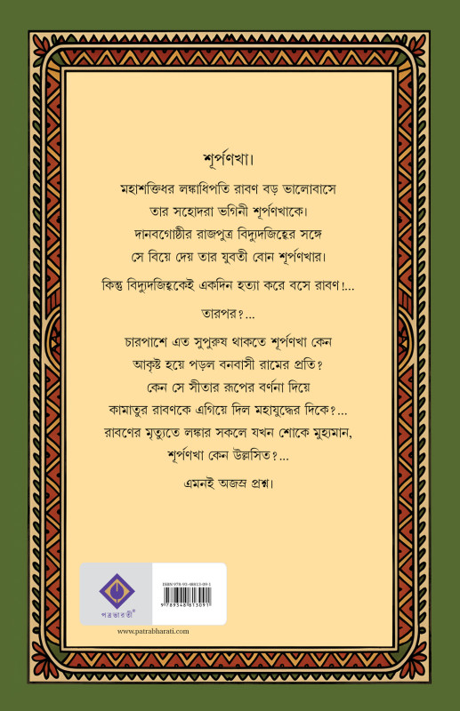 কিন্তু বিদ্যুদজিহ্বকেই একদিন হত্যা করে বসে রাবণ! বিহ্বল হয়ে যায় স্বামীহারা শূর্পণখা। এই হত্যার পিছনে রাবণের কি কোনও গোপন দূরভিসন্ধি ছিল?... শূর্পণখা কি মেনে নেয় তার এই স্বামী হনন? নাকি তার মধ্যে নিরন্তর জ্বলছিল প্রতিশোধের আগুন?...চারপাশে এত সুপুরুষ থাকতে শূর্পণখা কেন আকৃষ্ট হয়ে পড়ল বনবাসী রামের প্রতি? কেন সে সীতার রূপের বর্ণনা দিয়ে কামাতুর রাবণকে এগিয়ে দিল মহাযুদ্ধের দিকে?...রাবণের মৃত্যুতে লঙ্কার সকলে যখন শোকে মুহ্যমান, শূর্পণখা কেন উল্লসিত?...