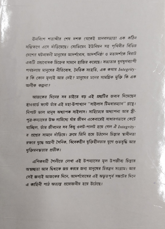 আজকের দিনের সব চাইতে বড় এই প্রশ্নটির জবাব দিয়েছেন হাওয়ার্ড ফার্স্ট তাঁর এই মহা-উপাখ্যান "সাইলাস টিমবারম্যান" গ্রন্থে। নিপাট ভাল মানুষ অধ্যাপক সাইলাস। সাহিত্যের অধ্যাপনা আর স্ত্রী- পুত্র-কন্যাদের উষ্ণ সান্নিধ্যে যাঁর জীবন একেবারেই সাধারণভাবে কেটে যাচ্ছিল, তাঁর জীবনের সব কিছু ওলট-পালট হয়ে গেল ঐ Integrity- র প্রশ্নের সামনে দাঁড়িয়ে। ক্রমে তিনি হয়ে উঠলেন চিন্তার স্বাধীনতা রক্ষার যুদ্ধে অগ্রণী সৈনিক, বিবেকহীন যুক্তিহীনতার যুগে শুভবুদ্ধি আর যুক্তিমনস্কতার প্রতীক।
