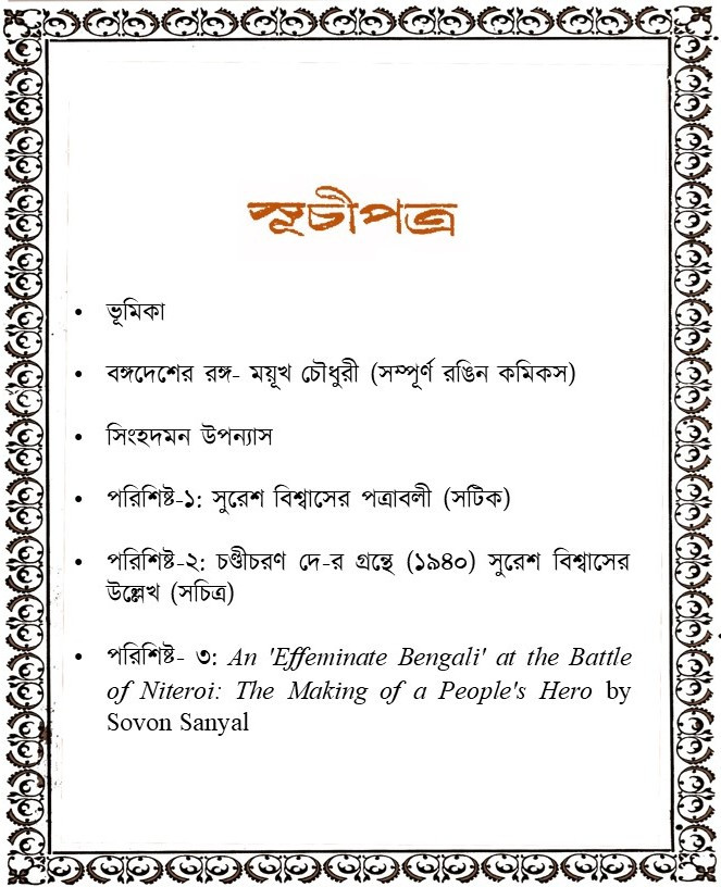 সিংহদমন লেফটেন্যান্ট সুরেশ বিশ্বাসের আশ্চর্য অ্যাডভেঞ্চারপূর্ণ জীবন নিয়ে লেখা এক উপন্যাস। ব্রাজিলেকে নাথেরয় যুদ্ধে একা হাতে জেতানো এই বাঙালী বীরের কথা আজকের বাঙালী ভুলেই গেছে হয়ত। জীবনের শুরু তাঁর হিপোড্রোমে পশুর খেলা দেখিয়ে। সিংহের সঙ্গে অকুতোভয় এই ভদ্রলোক কুস্তি করতেন জীবনের বাজি রেখে। তাঁর জীবন হার মানাবে যেকোন কাল্পনিক উপন্যাসকেও, সঙ্গে সুরেশের দুষ্প্রাপ্য ছবি, চিঠি, নথি ও সুরেশকে নিয়ে বাংলায় প্রথম ও একমাত্র কমিকস।