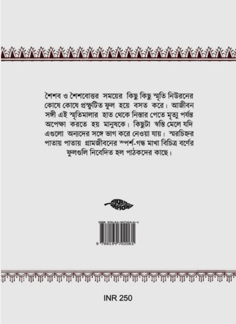 শৈশব ও শৈশবোত্তর সময়ের কিছু কিছু স্মৃতি নিউরনের কোষে কোষে প্রস্ফুটিত ফুল হয়ে বসত করে। আজীবন সঙ্গী এই স্মৃতিমালার হাত থেকে নিস্তার পেতে মৃত্যু পর্যন্ত অপেক্ষা করতে হয় মানুষকে। কিছুটা স্বস্তি মেলে যদি এগুলো অন্যদের সঙ্গে ভাগ করে নেওয়া যায়। স্মরচিহ্নর পাতায় পাতায় গ্রামজীবনের স্পর্শ-গন্ধ মাখা বিচিত্র বর্ণের ফুলগুলি নিবেদিত হল পাঠকের কাছে।