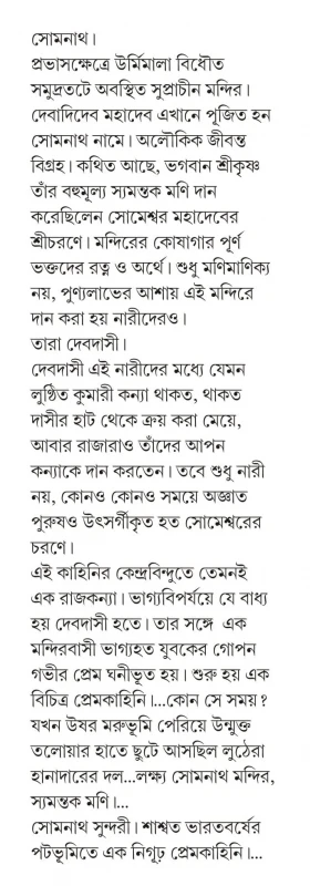 এই কাহিনির কেন্দ্রবিন্দুতে তেমনই এক রাজকন্যা ৷ ভাগ্যবিপর্যয়ে যে বাধ্য হয় দেবদাসী হতে৷ তার সঙ্গে এক মন্দিরবাসী ভাগ্যহত যুবকের গোপন গভীর প্রেম ঘনীভূত হয় ৷ শুরু হয় এক বিচিত্র প্রেমকাহিনি ৷…কোন সে সময়? যখন উষর মরুভূমি পেরিয়ে উন্মুক্ত তলোয়ার হাতে ছুটে আসছিল লুঠেরা হানাদারের দল…লক্ষ্য সোমনাথ মন্দির, স্যমন্তক মণি ৷…