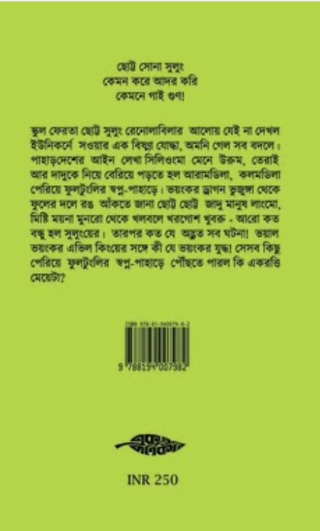স্কুল ফেরতা ছোট্ট সুলুং রেনোলাবিলার আলোয় যেই না দেখল ইউনিকর্মে সওয়ার এক বিষণ্ণ যোদ্ধা, অমনি গেল সব বদলে। পাহাড়দেশের আইন লেখা সিলিওংমা মেনে উরুম, তেরাই আর দাদুকে নিয়ে বেরিয়ে পড়তে হল আরামডিলা, কলমডিলা পেরিয়ে ফুলটুংলির স্বপ্ন-পাহাড়ে। ভয়ংকর ড্রাগন ভুজুঙ্গা থেকে ফুলের দলে রঙ আঁকতে জানা ছোট্ট ছোট্ট জাদু মানুষ লাংমো, মিষ্টি ময়না মুনরো থেকে খলবলে খরগোশ খুবরু আরো কত বন্ধু হল সুলুংয়ের। তারপর কত যে অদ্ভুত সব ঘটনা। ভয়াল ভয়ংকর এভিল কিংয়ের সঙ্গে কী যে ভয়ংকর যুদ্ধ! সেসব কিছু পেরিয়ে ফুলটুংলির স্বপ্ন-পাহাড়ে পৌঁছতে পারল কি একরত্তি মেয়েটা?