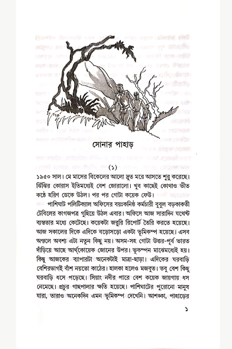 সদাশিব আর বুবুল অজানাকে আবিষ্কারের কৌতুহলী মন নিয়ে বেরিয়েছে বন-জঙ্গল-পাহাড় ডিঙিয়ে দূর্গম অজানা আসামের অন্যতম আকর্ষণ সোনার পাহাড়ের খোঁজে। এদের সঙ্গ দিয়েছেন কিছু আদিবাসী জনগোষ্ঠী, আবার গল্প এগোতে এগোতে আমরা দেখব অন্য হিংস্র আদিবাসী জনগোষ্ঠীর সঙ্গে লড়াই। বন্ধুত্ব ও বিশ্বাসঘাতকতার মাঝে হঠাৎ হঠাৎ এসে পড়া প্রাকৃতিক দুর্যোগের মোকাবিলা—এইরকম রূদ্ধশ্বাস অ্যাডভেঞ্চারের কাহিনী নিয়েই “সোনার পাহাড়” আমাদের হাতছানি দেয়।