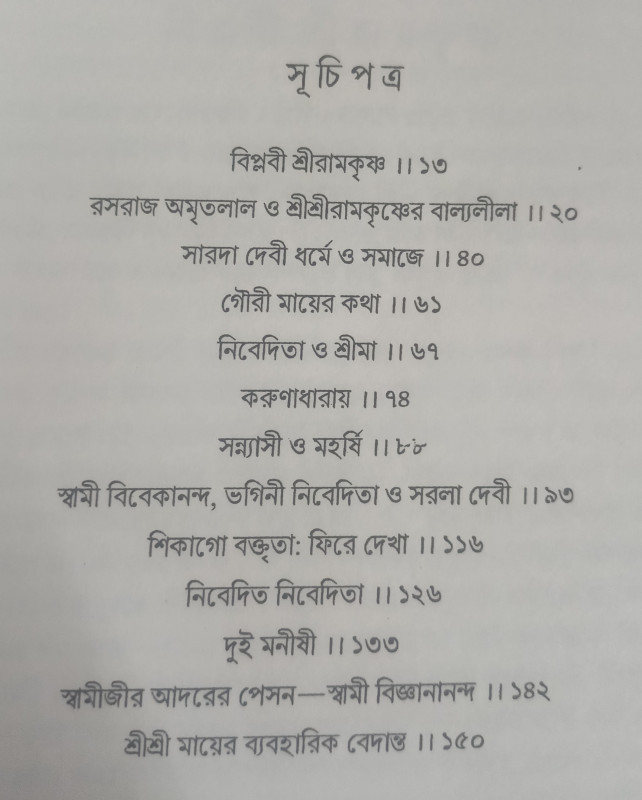 শ্রীরামকৃষ্ণ, শ্রীমা সারদা ও স্বামী বিবেকানন্দ কেবলমাত্র ধর্মজগতের মানুষ বলেই চিহ্নিত হন। এ আমাদের দুর্ভাগ্য। পল্লিগ্রামের দরিদ্র ব্রাহ্মণ সন্তান তথাকথিত নিরক্ষর গদাধর-যিনি রামকৃষ্ণ নামে পরিচিত এবং দরিদ্র ব্রাহ্মণ কন্যা, দক্ষিণেশ্বরের রাসমণির মন্দিরের পূজারীর স্ত্রী সারদার-বৈপ্লবিক চেতনা, কার্য-কলাপ, সীমানা সঙ্ঘন, সমাজ সংস্কার সাধারণতঃ আলোচিত হয় না। এই প্রবন্ধগুলি সেদিকটাই আলোকপাত করার প্রচেষ্টা। 'বিচিত্রপত্র গ্রন্থন বিভাগ'- এর সৌরদীপ, অয়ন ও সৌম্যকান্তির আন্তরিক উদ্যোগে এই গ্রন্থ-প্রকাশ সম্ভব হল। তাদের জানাই কৃতজ্ঞতা। দিব্যত্রয়ীর আশীর্বাদ তাদের ওপর বর্ষিত হোক। এছাড়াও গোলপার্ক রামকৃষ্ণ মিশন ইন্সটিটিউট অব কালচারের ভাষা বিভাগের কর্মী শ্রীমতী সুভদ্রা পাল বইটির মুদ্রণে সহায়তা করেছেন। এই গ্রন্থের কৃতিত্ব এঁদেরই। এখন, পাঠক-পাঠিকাদের ভালো লাগলেই আনন্দিত হব।"