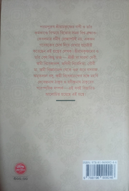 পরমপুরুষ শ্রীরামকৃষ্ণের বাণী ও তাঁর কর্মকাণ্ডে বিস্ময়ে বিভোর সমগ্র বিশ্ব-ব্রহ্মাণ্ড। কেবলমাত্র ধর্মীয় প্রেক্ষাপটই নয়, একজন গবেষকের চোখ দিয়ে দেখার প্রচেষ্টাই করেছেন এই গ্রন্থের লেখক। শ্রীরামকৃষ্ণদেব ও তাঁর বেশ কিছু ভক্ত— শ্রীশ্রী মা সারদা দেবী, স্বামী বিবেকানন্দ, ভগিনী নিবেদিতা, গৌরী মা, স্বামী বিজ্ঞানানন্দ থেকে শুরু করে রসরাজ অমৃতলাল বসু, স্বামী বিবেকানন্দের সঙ্গে মহর্ষি দেবেন্দ্রনাথ ঠাকুর ও রবীন্দ্রনাথ ঠাকুরের পারস্পরিক সম্পর্ক—এই সবই বিস্তারিত আলোচিত হয়েছে এই গ্রন্থে।