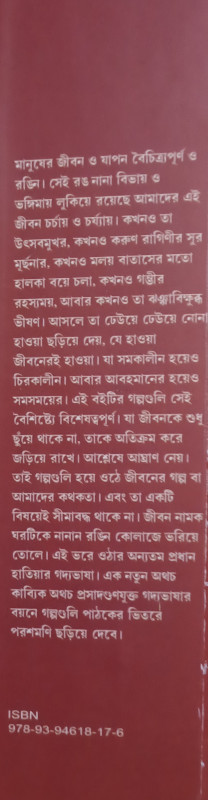 মানুষের জীবন ও যাপন বৈচিত্র্যপূর্ণ ও রঙিন। সেই রঙ নানা বিভায় ও ভঙ্গিমায় লুকিয়ে রয়েছে আমাদের এই জীবন চর্চায় ও চ্যায়। কখনও তা উৎসবমুখর, কখনও করুণ রাগিণীর সুর মূর্ছনার, কখনও মলয় বাতাসের মতো হালকা বয়ে চলা, কখনও গম্ভীর রহস্যময়, আবার কখনও তা ঝঞ্ঝাবিক্ষুব্ধ ভীষণ। আসলে তা ঢেউয়ে ঢেউয়ে নোনা হাওয়া ছড়িয়ে দেয়, যে হাওয়া জীবনেরই হাওয়া। যা সমকালীন হয়েও চিরকালীন। আবার আবহমানের হয়েও সমসময়ের। এই বইটির গল্পগুলি সেই বৈশিষ্ট্যে বিশেষত্বপূর্ণ। যা জীবনকে শুধু ছুঁয়ে থাকে না, তাকে অতিক্রম করে জড়িয়ে রাখে। আশ্লেষে আঘ্রাণ নেয়। তাই গল্পগুলি হয়ে ওঠে জীবনের গল্প বা আমাদের কথকতা। এবং তা একটি বিষয়েই সীমাবদ্ধ থাকে না। জীবন নামক ঘরটিকে নানান রঙিন কোলাজে ভরিয়ে তোলে। এই ভরে ওঠার অন্যতম প্রধান হাতিয়ার গদ্যভাষা। এক নতুন অথচ কাব্যিক অথচ প্রসাদগুণযুক্ত গদ্যভাষার বয়নে গল্পগুলি পাঠকের ভিতরে পরশমণি ছড়িয়ে দেবে।