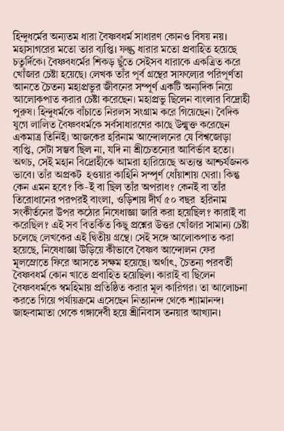 হিন্দুধর্মের অন্যতম ধারা বৈষ্ণবধর্ম সাধারণ কোনও বিষয় নয়। মহাসাগরের মতো তার ব্যপ্তি। ফন্তু ধারার মতো প্রবাহিত হয়েছে চতুর্দিকে। বৈষ্ণবধর্মের শিকড় ছুঁতে সেইসব ধারাকে একত্রিত করে খোঁজার চেষ্টা হয়েছে। লেখক তাঁর পূর্ব গ্রন্থের সাফল্যের পরিপূর্ণতা আনতে চৈতন্য মহাপ্রভুর জীবনের সম্পূর্ণ একটি অন্যদিক নিয়ে আলোকপাত করার চেষ্টা করেছেন। মহাপ্রভু ছিলেন বাংলার বিদ্রোহী পুরুষ। হিন্দুধর্মকে বাঁচাতে নিরলস সংগ্রাম করে গিয়েছেন। বৈদিক যুগে লালিত বৈষ্ণবধর্মকে সর্বসাধারণের কাছে উন্মুক্ত করেছেন একমাত্র তিনিই। আজকের হরিনাম আন্দোলনের যে বিশ্বজোড়া ব্যপ্তি, সেটা সম্ভব ছিল না, যদি না শ্রীচেতন্যের আবির্ভাব হতো। অথচ, সেই মহান বিদ্রোহীকে আমরা হারিয়েছে অত্যন্ত আশ্চর্যজনক ভাবে। তাঁর অপ্রকট হওয়ার কাহিনি সম্পূর্ণ ধোঁয়াশায় ঘেরা। কিন্তু কেন এমন হবে? কি-ই বা ছিল তাঁর অপরাধ? কেনই বা তাঁর তিরোধানের পরপরই বাংলা, ওড়িশায় দীর্ঘ ৫০ বছর হরিনাম সংকীর্তনের উপর কঠোর নিষেধাজ্ঞা জারি করা হয়েছিল? কারাই বা করেছিল? এই সব বিতর্কিত কিছু প্রশ্নের উত্তর খোঁজার সামান্য চেষ্টা চলেছে লেখকের এই দ্বিতীয় গ্রন্থে। সেই সঙ্গে আলোকপাত করা হয়েছে, নিষেধাজ্ঞা উড়িয়ে কীভাবে বৈষ্ণব আন্দোলন ফের মূলস্রোতে ফিরে আসতে সক্ষম হয়েছে। অর্থাৎ, চৈতন্য পরবর্তী বৈষ্ণবধর্ম কোন খাতে প্রবাহিত হয়েছিল। কারাই বা ছিলেন বৈষ্ণবধর্মকে স্বমহিমায় প্রতিষ্ঠিত করার মূল কারিগর। তা আলোচনা করতে গিয়ে পর্যায়ক্রমে এসেছেন নিত্যানন্দ থেকে শ্যামানন্দ। জাহ্নবামাতা থেকে গঙ্গাদেবী হয়ে শ্রীনিবাস তনয়ার আখ্যান।