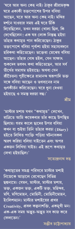 ‘মাস্টার মশায় যখন “কথামৃত” লেখেন, রাত্রিতে আমি কয়েকবার তাঁর কাছে উপস্থিত ছিলাম। গরম কালে ছাদের উপর বসিয়া কখন বা শুইয়া তিনি তাঁহার করচা (Diary) হইতে লিখিত পংক্তি পড়িয়া ঘটনাসকল স্মরণ করিয়া বলিয়া যাইতেন এবং অপর একজন লিখিয়া যাইত। এই রূপে কথামৃত লেখা হইয়াছিল।’