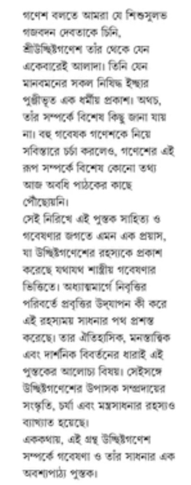 গণেশ বলতে আমরা যে শিশুসুলভগজবদন দেবতাকে চিনি, শ্রীউচ্ছিষ্টগণেশ তাঁর থেকে যেন একেবারেই আলাদা। তিনি যেন মানবমনের সকল নিষিদ্ধ ইচ্ছার পুঞ্জীভূত এক ধর্মীয় প্রকাশ। অথচ, তাঁর সম্পর্কে বিশেষ কিছু জানা যায় না। বহু গবেষক গণেশকে নিয়ে সবিস্তারে চর্চা করলেও, গণেশের এই রূপ সম্পর্কে বিশেষ কোনো তথ্য আজ অবধি পাঠকের কাছে পৌঁছোয়নি।