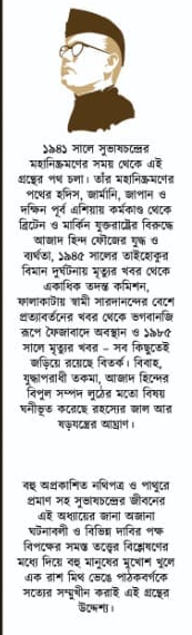 ১৯৪০ সাল থেকে শুরু করে এক সুবিস্তৃত সময়কাল পর্যন্ত নেতাজি সুভাষচন্দ্র বসুর জ্ঞাত-অজ্ঞাত কর্মকান্ড ও তৎসংক্রান্ত ঘটনাবলীর ইতিপূর্বে অপ্রকাশিত বহু নথিপত্রের ভিত্তিতে বিশ্লেষণ, একাধিক তত্ত্ব ও মিথের অবসান এবং ষড়যন্ত্রের মুখোশ খুলে সত্যের অন্বেষণ।